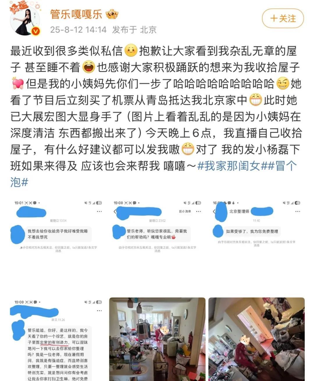 管乐家的片段火出圈后,8月12日,管乐发博表示最近收到很多私信,抱歉让大家看到杂乱无章的屋子,并表示自己的小姨妈已经从青岛飞到北京帮她整理屋子。