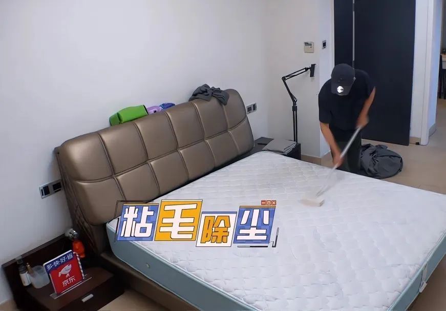 然后,他开始换四件套,先粘毛,再除螨消毒,再换被套,然后开始扫地,用湿纸巾擦地。