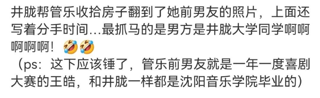 井胧整理抽屉时,不小心把管乐前男友给翻出来。最抓马的是,井胧和管乐的前男友是大学同学,这就是缘分吧。