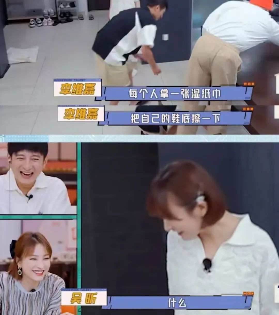 节目里,维嘉给客人准备的并非拖鞋,而是全新酒店拖鞋,做了一会饭,大家一起用湿纸巾擦一遍鞋底。